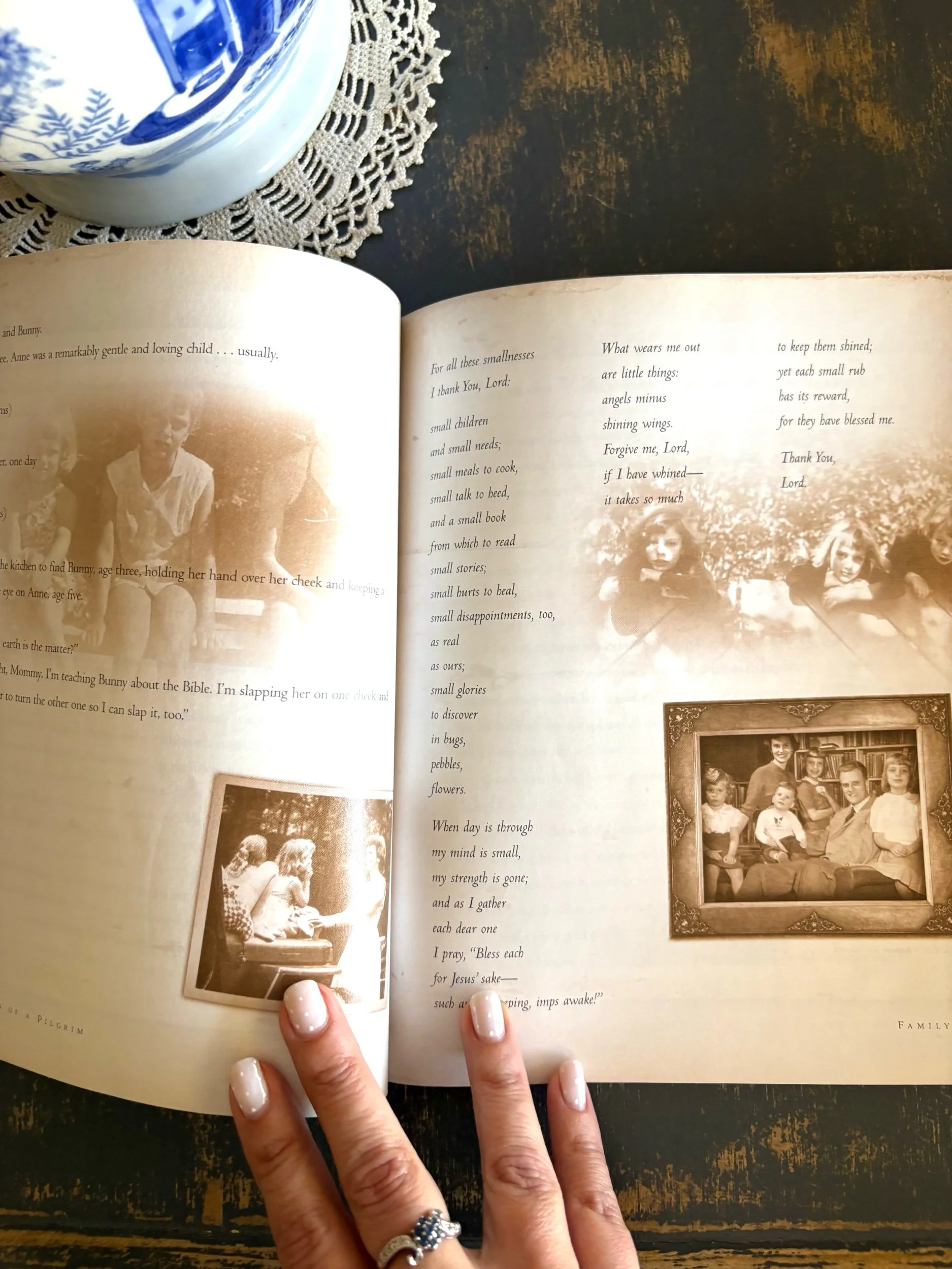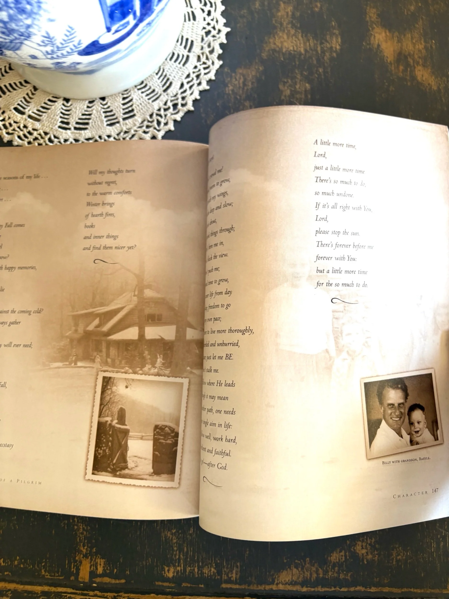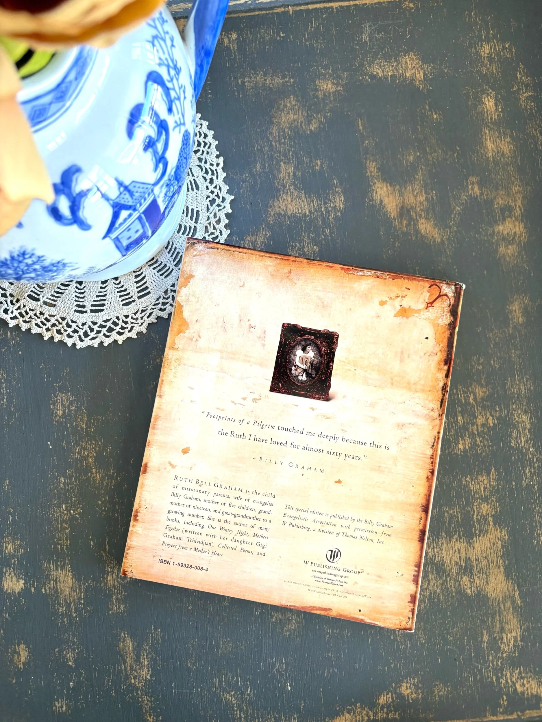 “Footprints Of A Pilgrim is Ruth Bell Graham's life story told in her own words (weaving together her prose and poetry) with added tidbits and anecdotes from her family (husband Billy and her children Gigi, Anne, Franklin, Ruth and Ned) and many of her friends (including Barbara Bush, Lady Bird Johnson, Jan Karon, Patricia Cornwell and others). With snatches of insight and glimpses of grace, Footprints Of A Pilgrim tells the story of a life (a very full and special life) complete with memories of joy, pain, brokenness, and healing. Also included are many never before published pictures which illustrate the remarkable journey of Ruth Bell Graham, as a child of a missionaries in Quingjiang, China in 1920, until today at her home in Little Piney Cove, Montreat, North Carolina.”